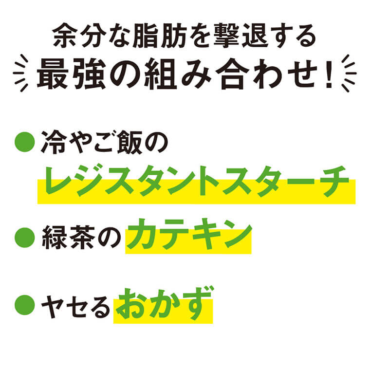 冷やし茶漬けは、冷やご飯に含まれる「レジスタントスターチ」と、緑茶の「カテキン」の効果で脂肪を分解。さらに、「ヤセるおかず」を一緒に食べることで、栄養も補いながら飽きずに続けられます。