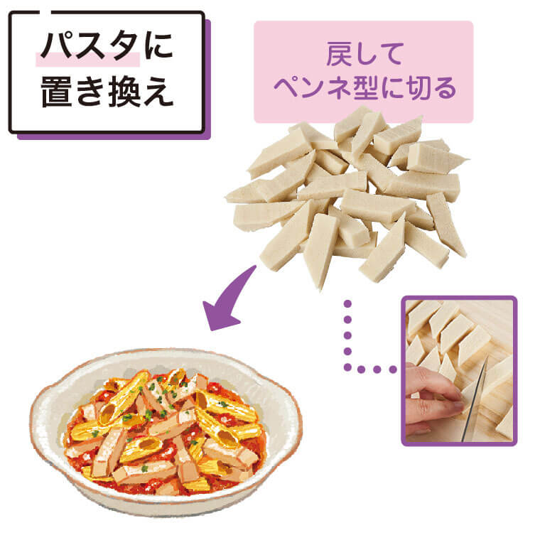 半分の厚さにしてから細切りにし、さらに斜めに切ってペンネ型に。高糖質になりがちなパスタ料理も、半量をペンネに見立てた高野豆腐に代えれば、グッとヘルシーに。ソースがからむうえに、腹持ちがいい具としても楽しむことができます。