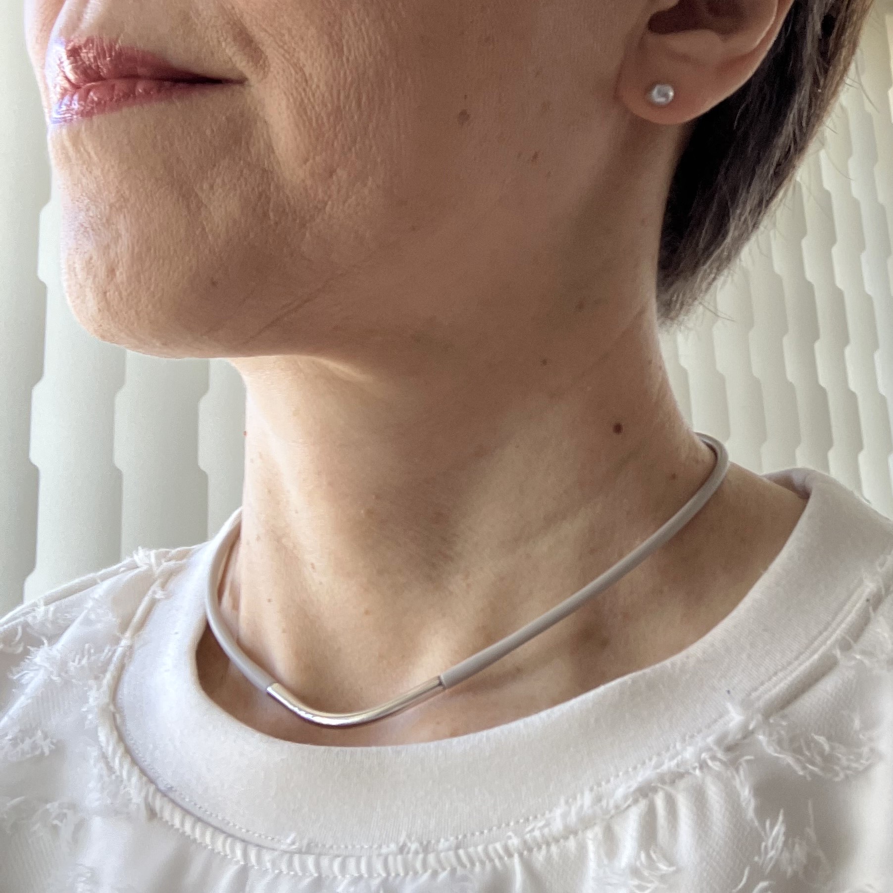 「Lierrey ループネックレス」はグレージュを以前から愛用していますが、トップがゴールドなので、「シルバーもあればいいのに」とひそかに思っていました。サンドベージュは「Lierrey ループネックレス」では初めてのシルバートップなので、シルバーのピアスやTシャツ、デニム、黒やグレーのタートルにも合わせすく、1週間毎日つけ続けられました。原稿の締め切りが重なりPCと向き合う時間が多い時期でしたが、首肩のコリを感じにくく、マッサージに行かなくても乗り切ることができたのは「Lierrey ループネックレス」のおかげ。