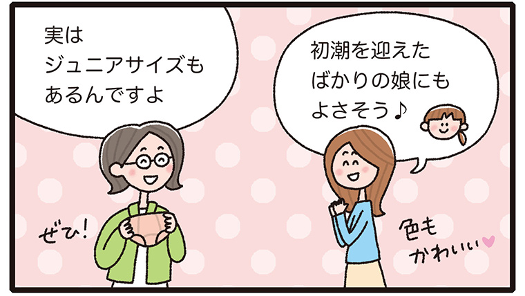 経血量が少ない生理の後半は同じナプキンを長時間つけていることが多く、ナプキンがよれて肌がかゆくなることがありました。このショーツはその点を気にせずに過ごせるので、とても快適でした。(T・Yさん/47歳)