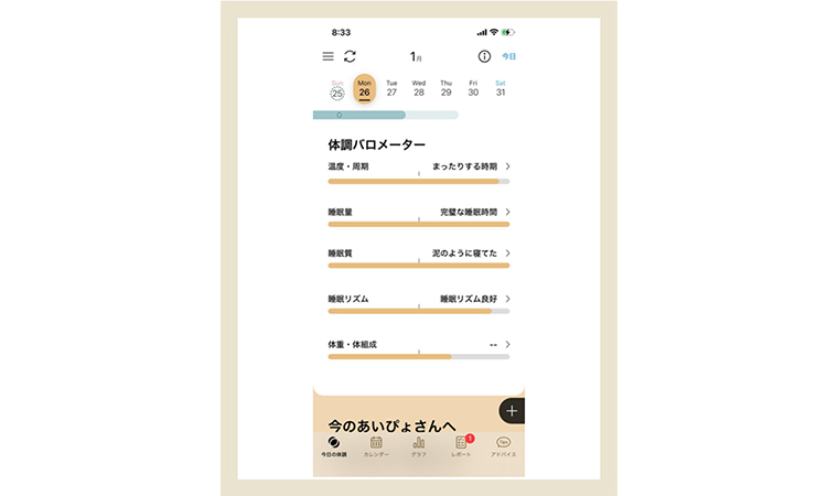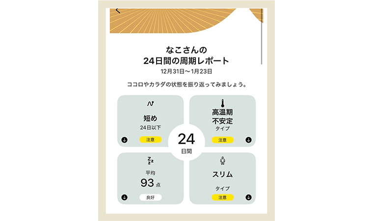 さらに、日記感覚で心身の状態を手軽に記録でき、計測・記録データをもとに、生理周期ごとのパーソナル体調レポートも自動生成。自分の心身の傾向を振り返り、客観的に見つめることができます。